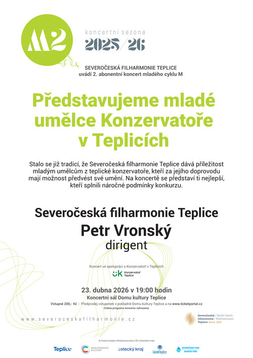 Es ist bereits zur Tradition geworden, dass die Nordböhmische Philharmonie Teplice jungen Künstlern des Teplice-Konservatoriums die Möglichkeit gibt, ihre Kunst unter ihrer Begleitung zu präsentieren. Beim Konzert treten die besten Interpreten auf, die die anspruchsvollen Vorspielbedingungen erfüllt haben.