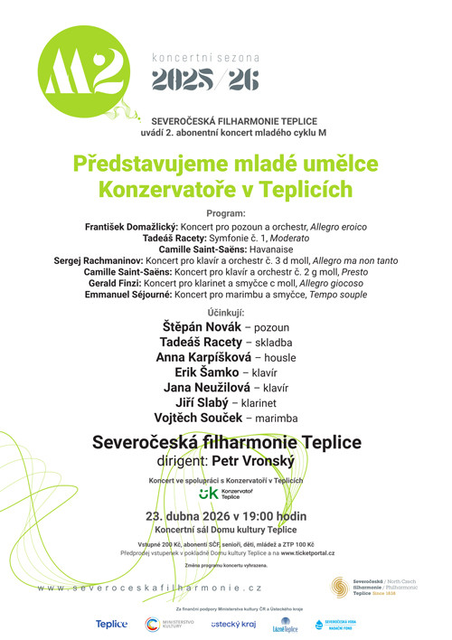 Der innovative M-Zyklus präsentiert in Zusammenarbeit mit der Nordböhmischen Philharmonie Teplice junge talentierte Dirigenten und Solisten des Teplice-Konservatoriums sowie der Koutnik-Akademie, die sich auf die Ausbildung der besten jungen Künstler aus der ganzen Welt konzentriert. Das abwechslungsreiche Programm bietet den Zuhörern eine Dramaturgie, die sich auf große symphonische Kompositionen und berühmte konzertante Werke konzentriert, aber auch einige einzigartige Kompositionen präsentiert, die Teil des Programms internationaler Künstlerwettbewerbe sind.